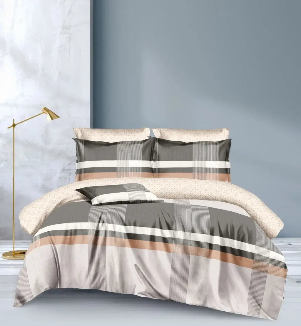 Az Aura 6 részes ágynemű garnitúra modern és harmonikus megjelenést kölcsönöz minden hálószobának. Külső oldalán elegáns sávos, geometriai minták jelennek meg barna, szürke és narancssárga árnyalatokban, míg a belső oldal finom, apró mintázatával egészíti ki a stílusos dizájnt. Ez az ágynemű szett egyszerre biztosít esztétikai élményt és kiváló kényelmet, amely a mindennapok során is megbízható társ lesz.